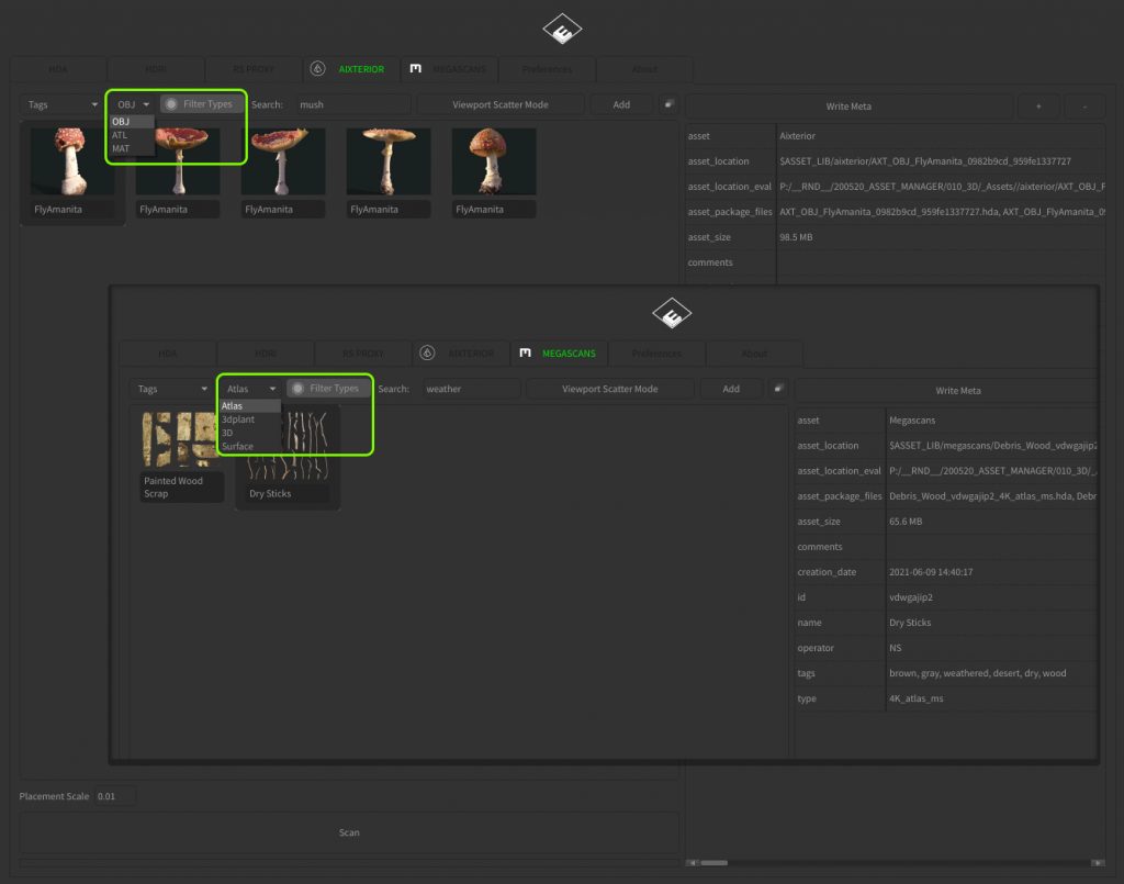- add Filter Types to select specific Assets for Aixterior and Megascans