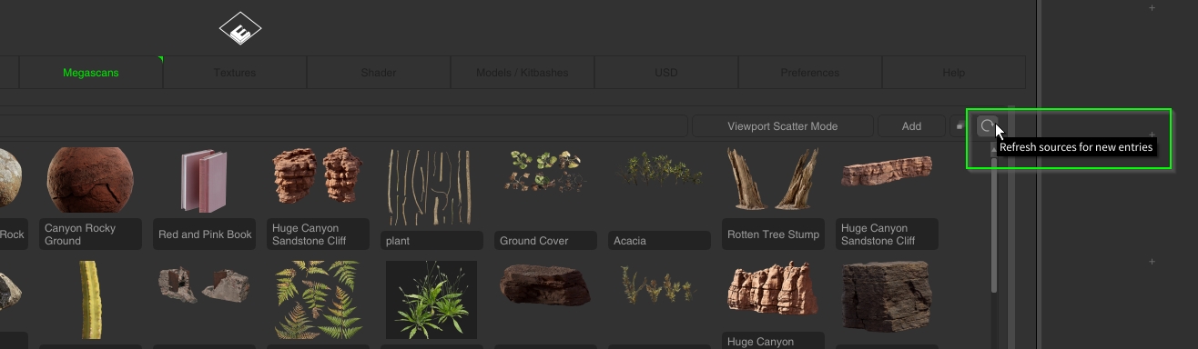 Go to “Preferences” and press “Additional Library”. “Add Library” and there you choose “MEGASCANS_Library”.