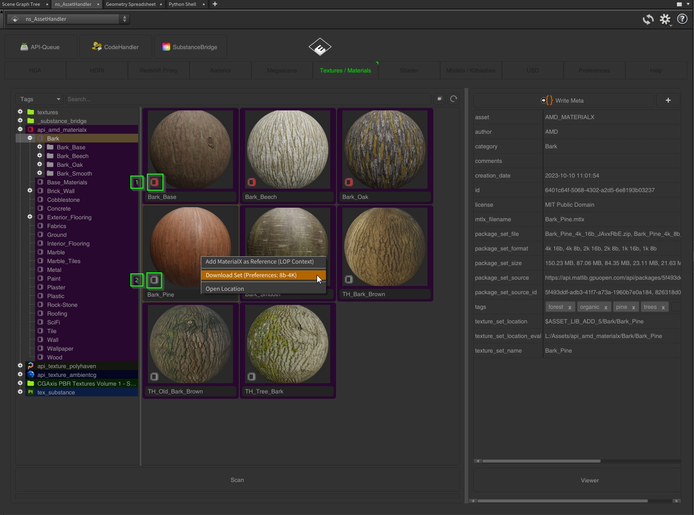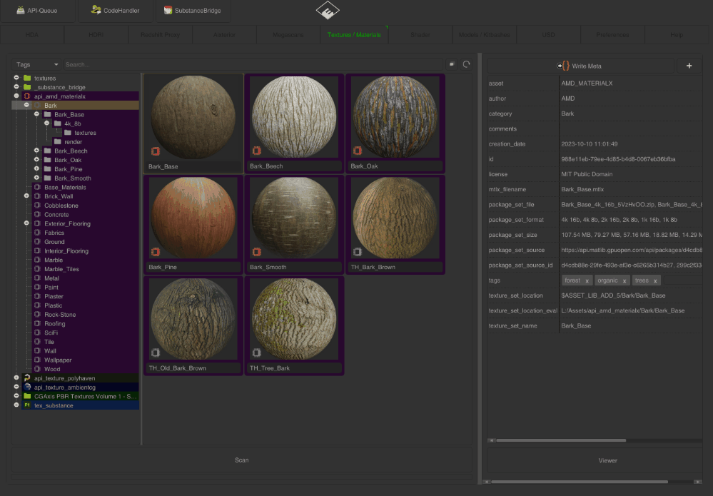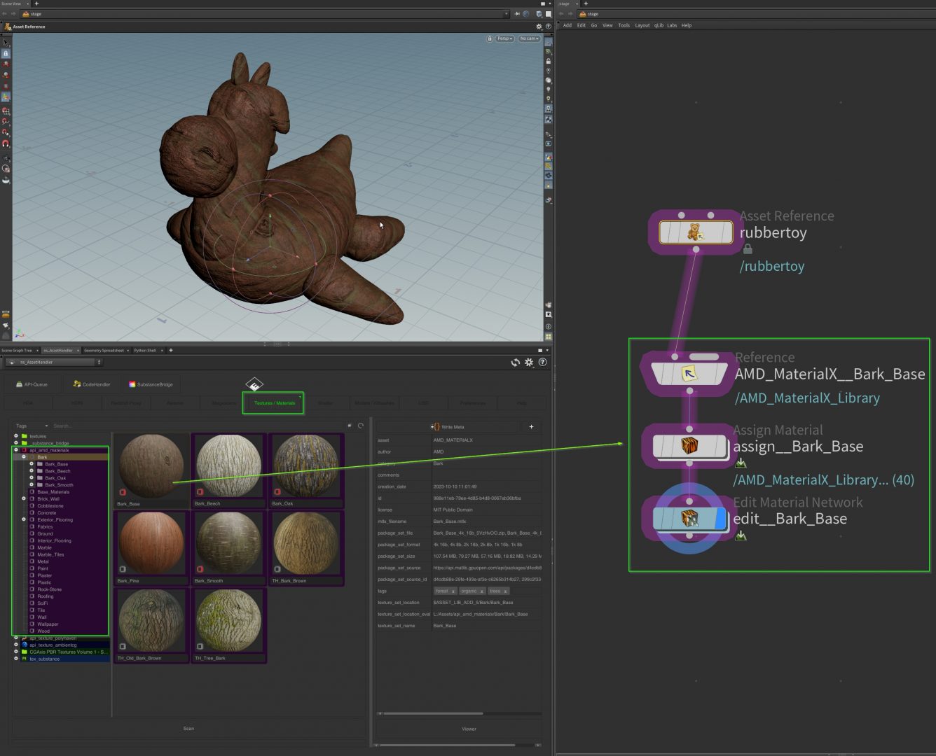 The library appears under the “Texture/Materials” tabs and will scan dynamically the sources adn categories via the AMD API. You can drag and drop directly the MaterialX in the LOPs Network.