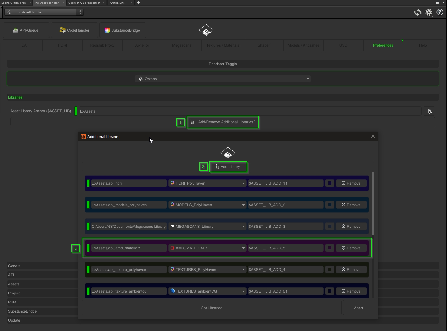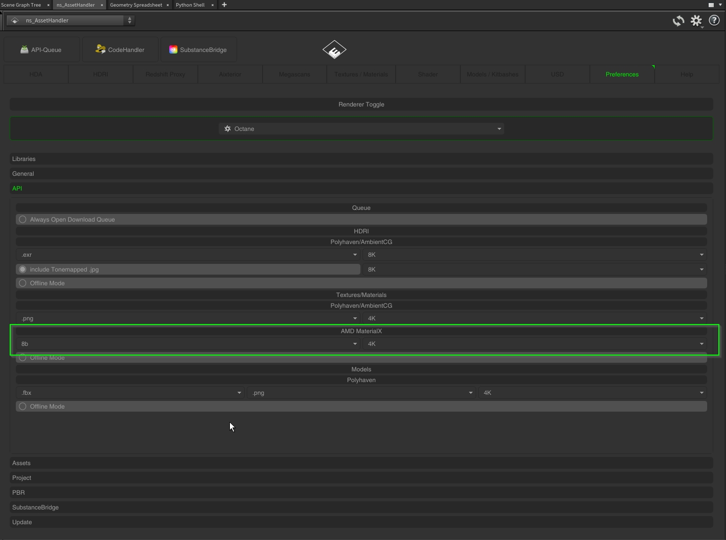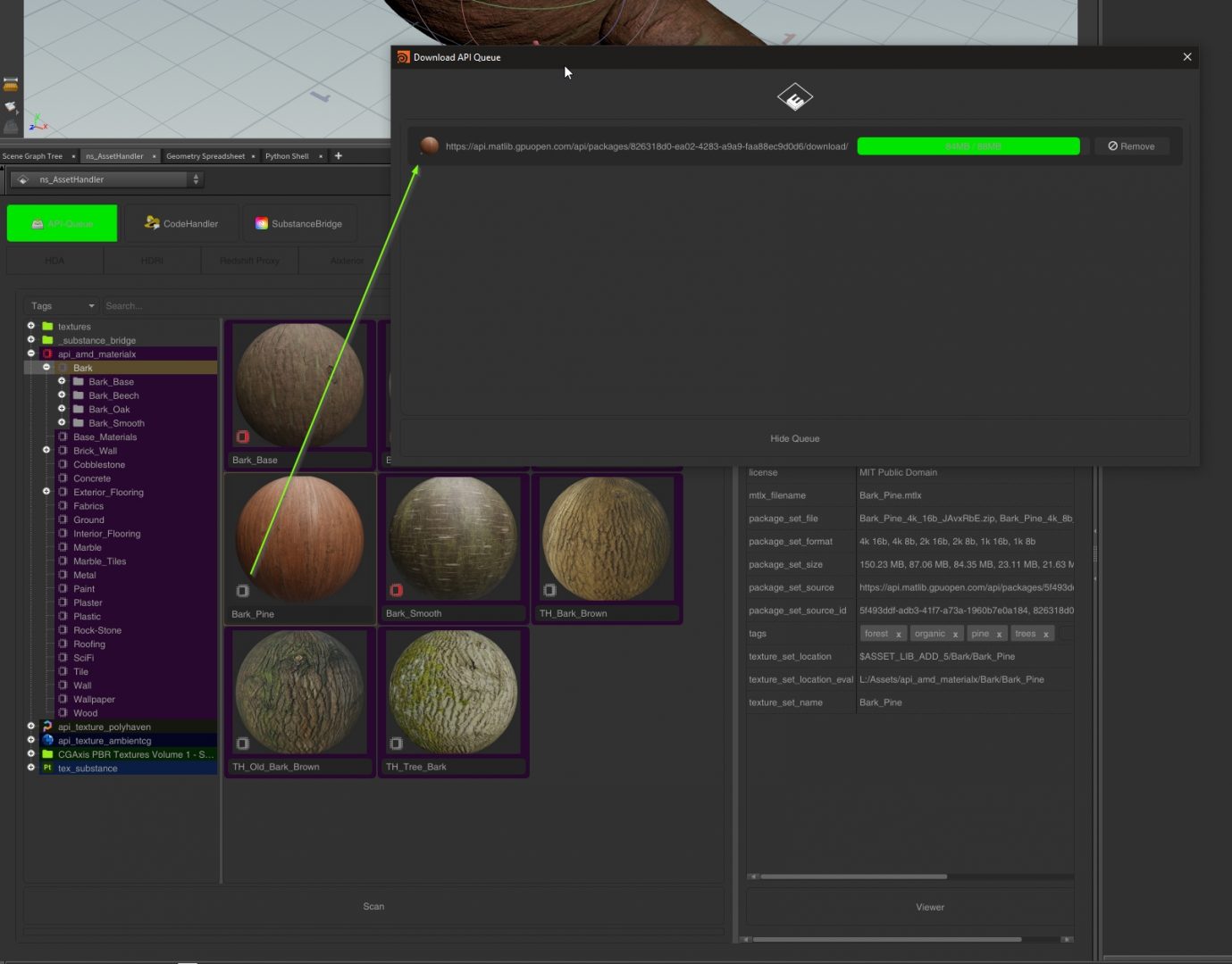 The library appears under the “Texture/Materials” tabs and will scan dynamically the sources adn categories via the AMD API. You can drag and drop directly the MaterialX in the LOPs Network.
